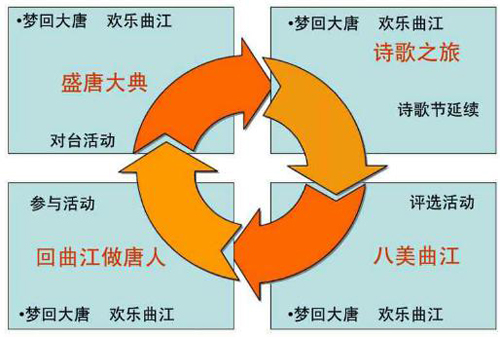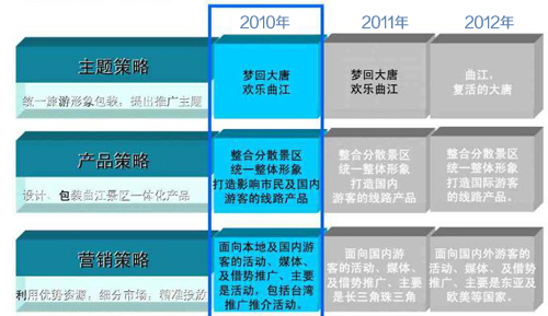 全年围绕“梦回大唐,欢乐曲江”这条主线,从整体形象树立、产品包装设计、营销宣传推广等各环节入手,全面展开“曲江旅游”营销工作。